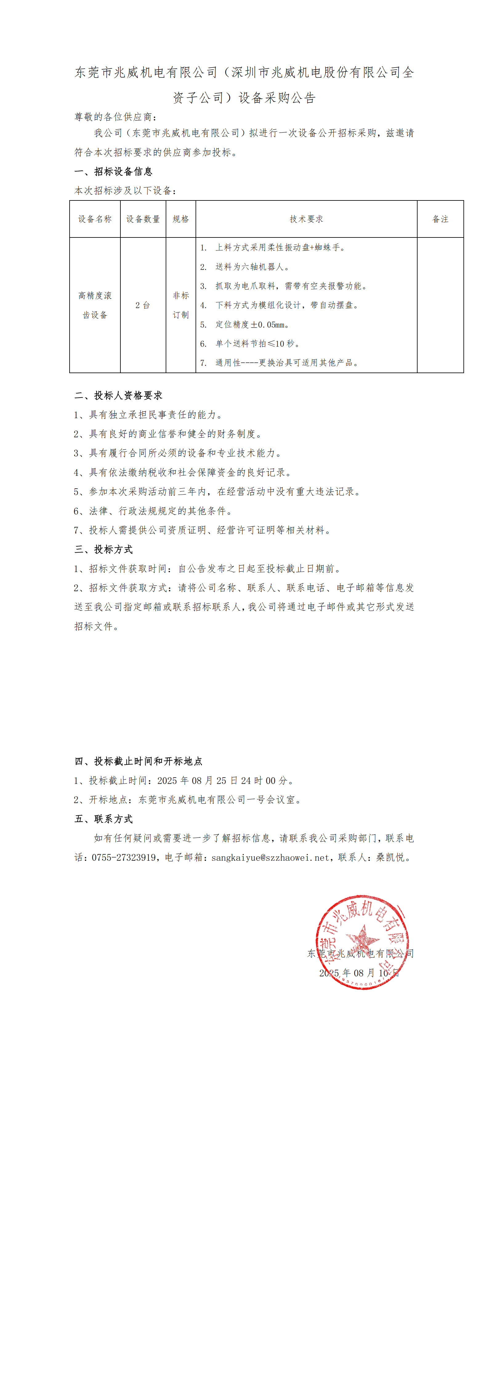东莞市HJC黄金城官网机电有限公司滚齿机设备采购公告 2025-08-10 11:00 相关推荐 2021年宝博会展台设计方案评审结果 2021中国国际信息展览会展台设计方案评审结果 设备采购招标公告 建设“深圳市智能机器人微型驱动控制系统工程研究中心”设备采购公告 东莞市HJC黄金城官网机电有限公司设备采购公告 东莞市HJC黄金城官网机电有限公司自动化设备采购公告 上一篇 东莞市HJC黄金城官网机电有限公司自动化设备采购公告 下一篇 东莞市HJC黄金城官网机电有限公司设备采购公告 推荐方案 电动自行车电子避震器微型齿轮箱解决方案 医疗胰岛素注射笔驱动系统应用 汽车空调出风口调节执行器应用 割草机器人电动滚筒执行器应用 电动夹爪驱动系统应用 最新动态 载誉前行!HJC黄金城官网机电斩获第八届广东省政府质量奖 二十四载深耕微型驱动,HJC黄金城官网机电以创新绘就微型驱动新蓝图 “聚力价值·兆就威来”HJC黄金城官网机电2025年迎新春暨颁奖盛典圆满结束 HJC黄金城官网机电荣获“2024深圳机器人年度评选”双奖,赋能行业技术创新 HJC黄金城官网机电灵巧手亮相CES 2025,开启机器人技术新纪元 在线留言 MESSAGES 公司名(*): 姓名(*): 电话(*): 微信号: 详细需求: 验证码: ??69 − 61 =